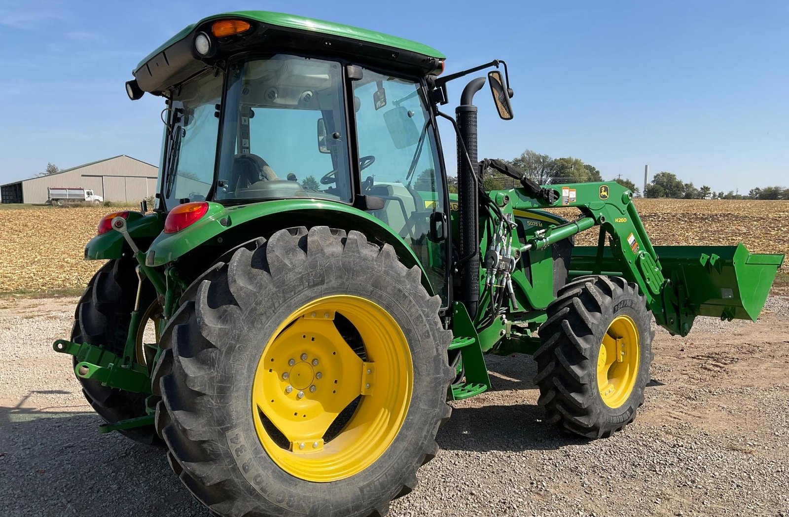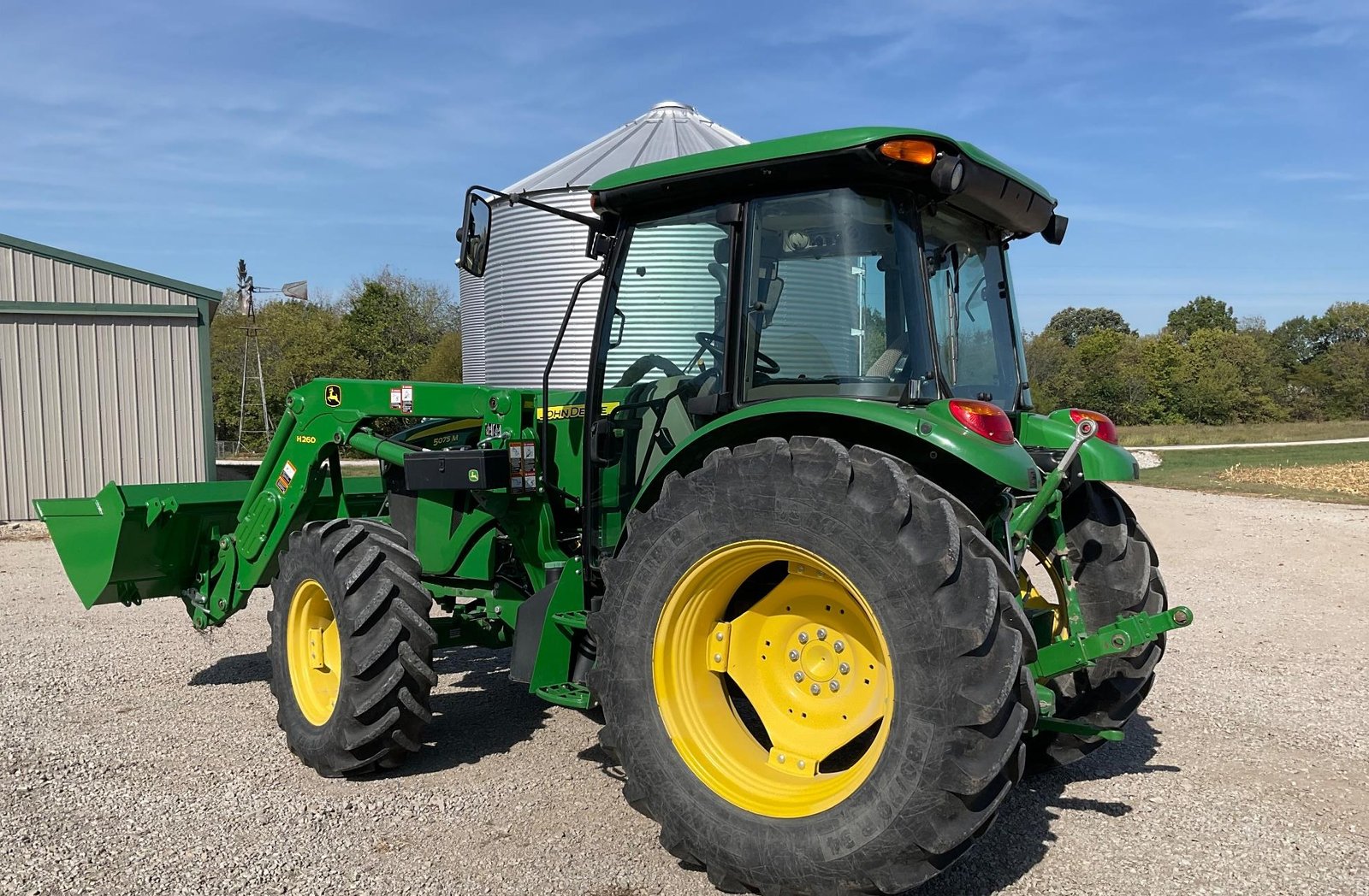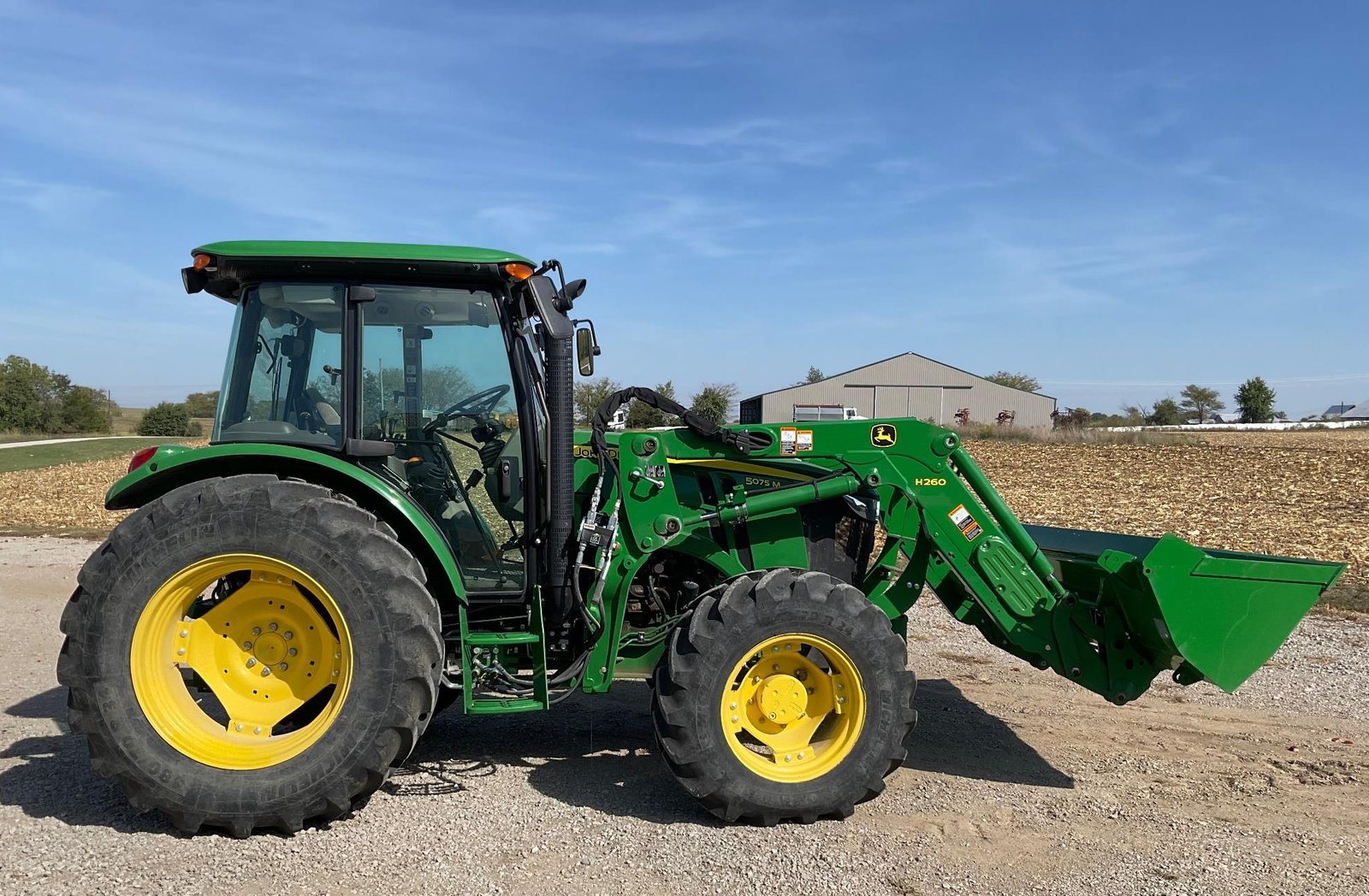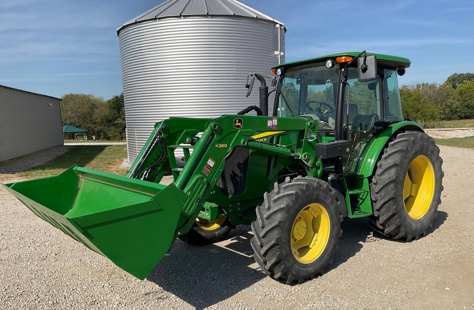 2015 John Deere 5075M MFWD tractor with 459 hours, powered by a John Deere 4-cylinder engine. Features 8 forward and 2 reverse speeds, 540 PTO, and a 3-point hitch. Equipped with a John Deere H260 loader with quick-attach bucket and joystick control. Solid, reliable tractor ready to work.