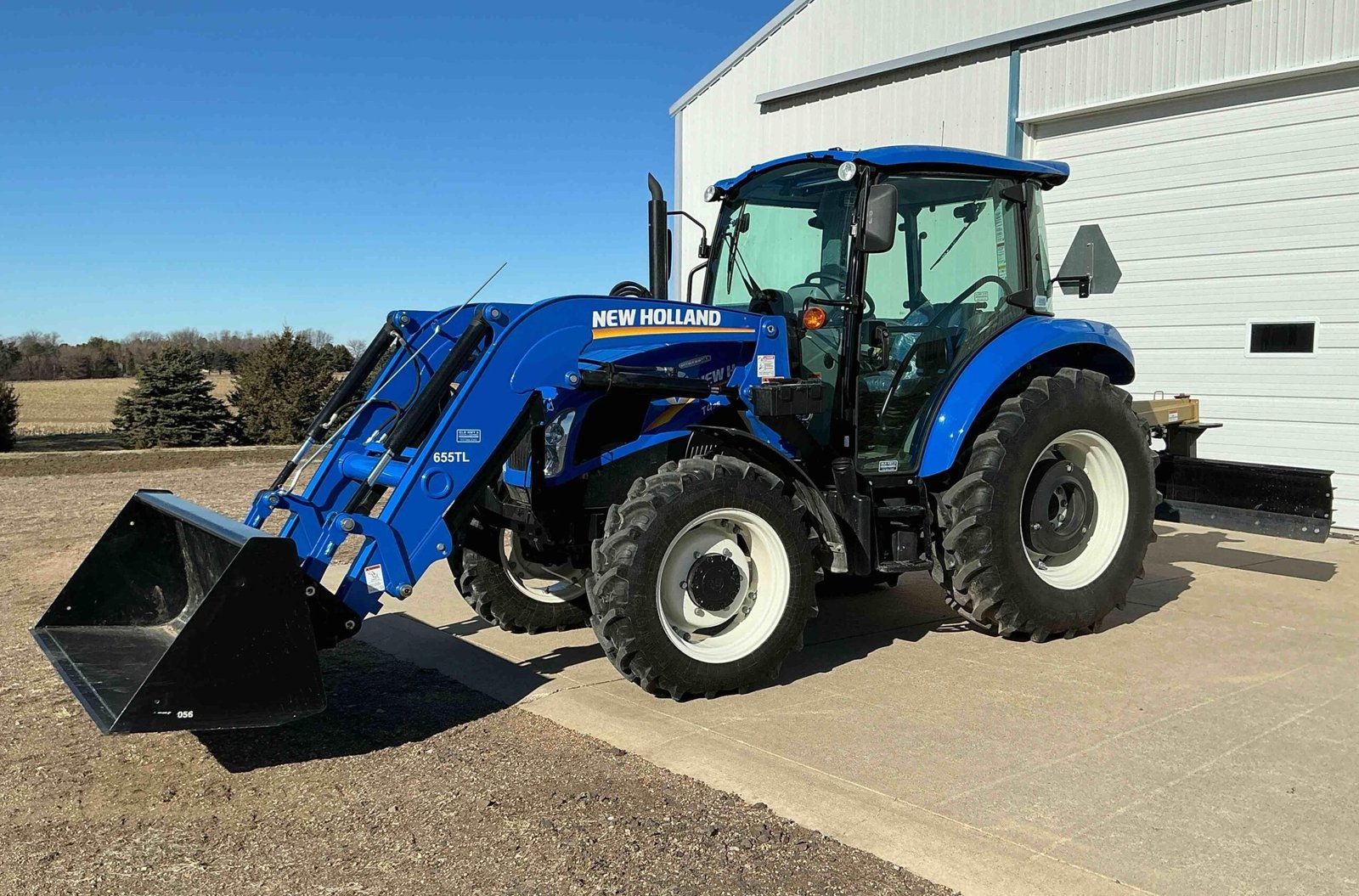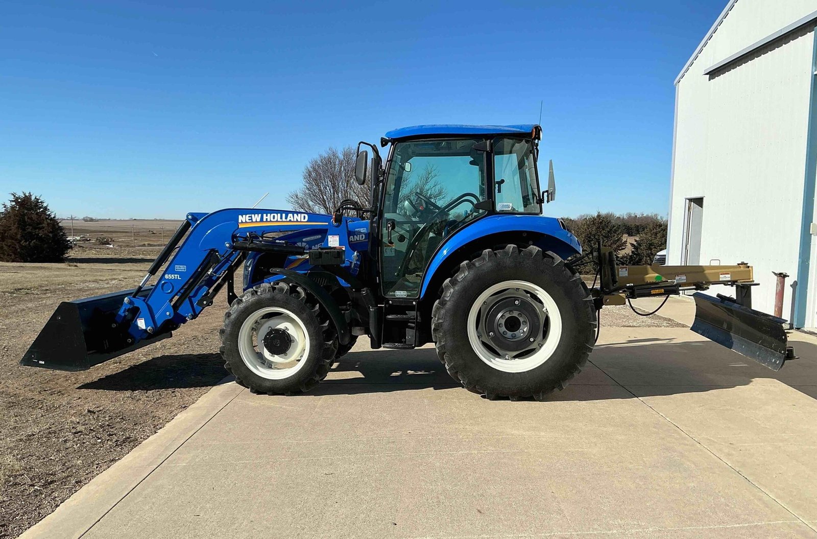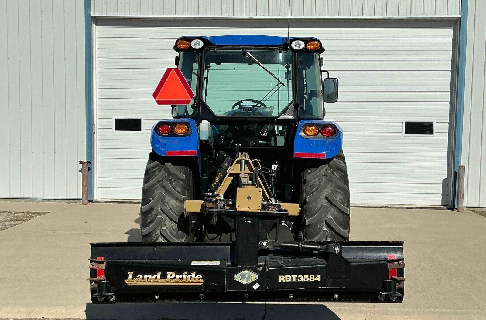 2015 New Holland PowerStar T4.75 MFWD tractor with 93 hours, 74 HP turbo diesel engine, and 12-speed shuttle transmission. Includes New Holland 655TL loader with 72″ bucket, Land Pride 84″ rear blade, 540 PTO, 3-point hitch, and enclosed cab with heat and A/C. Ready to work.