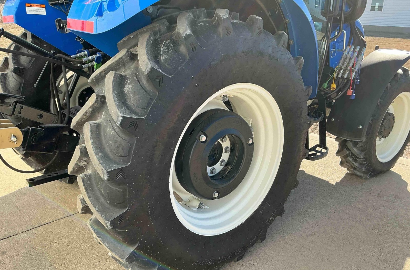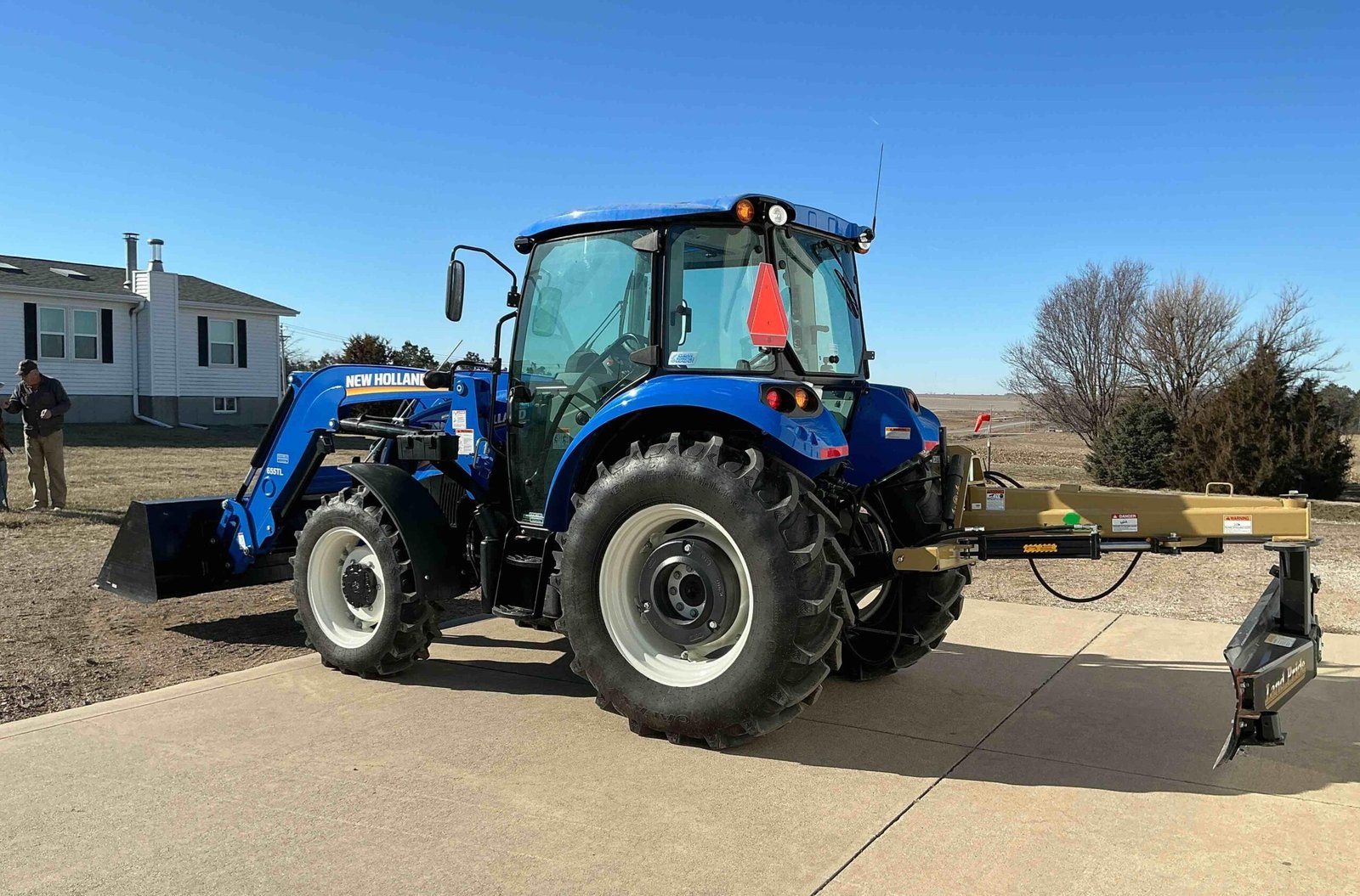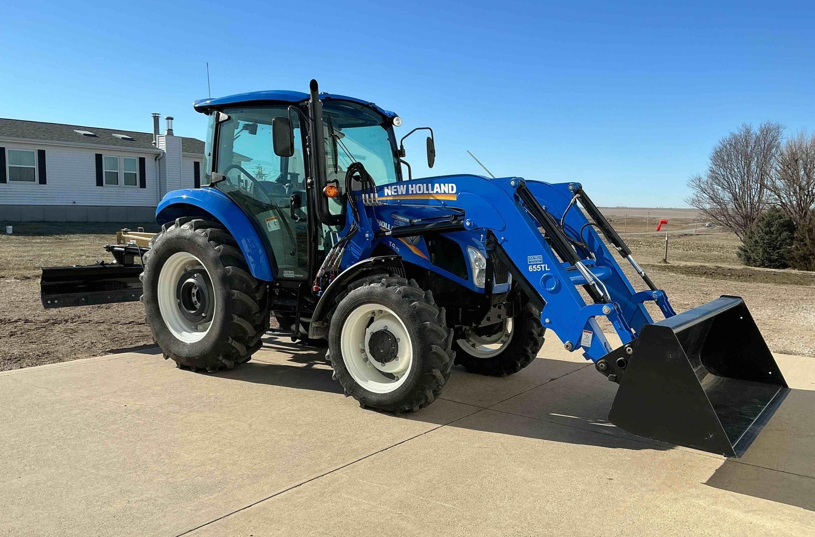 2015 New Holland PowerStar T4.75 MFWD tractor with 93 hours, 74 HP turbo diesel engine, and 12-speed shuttle transmission. Includes New Holland 655TL loader with 72″ bucket, Land Pride 84″ rear blade, 540 PTO, 3-point hitch, and enclosed cab with heat and A/C. Ready to work.