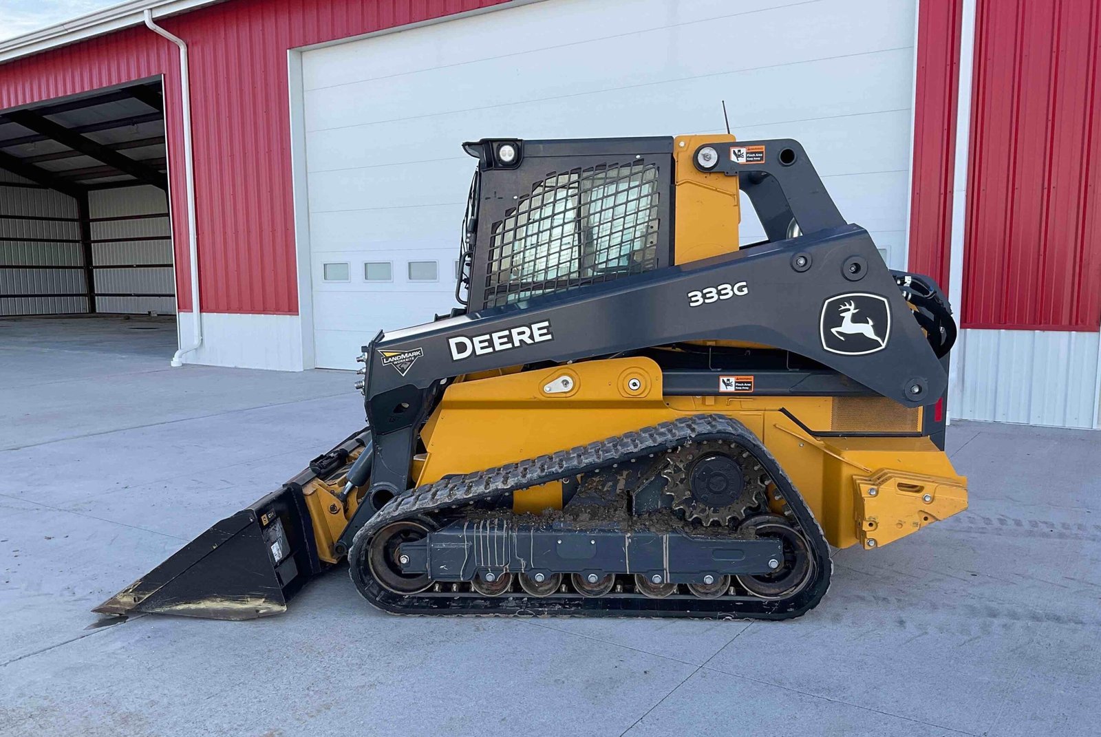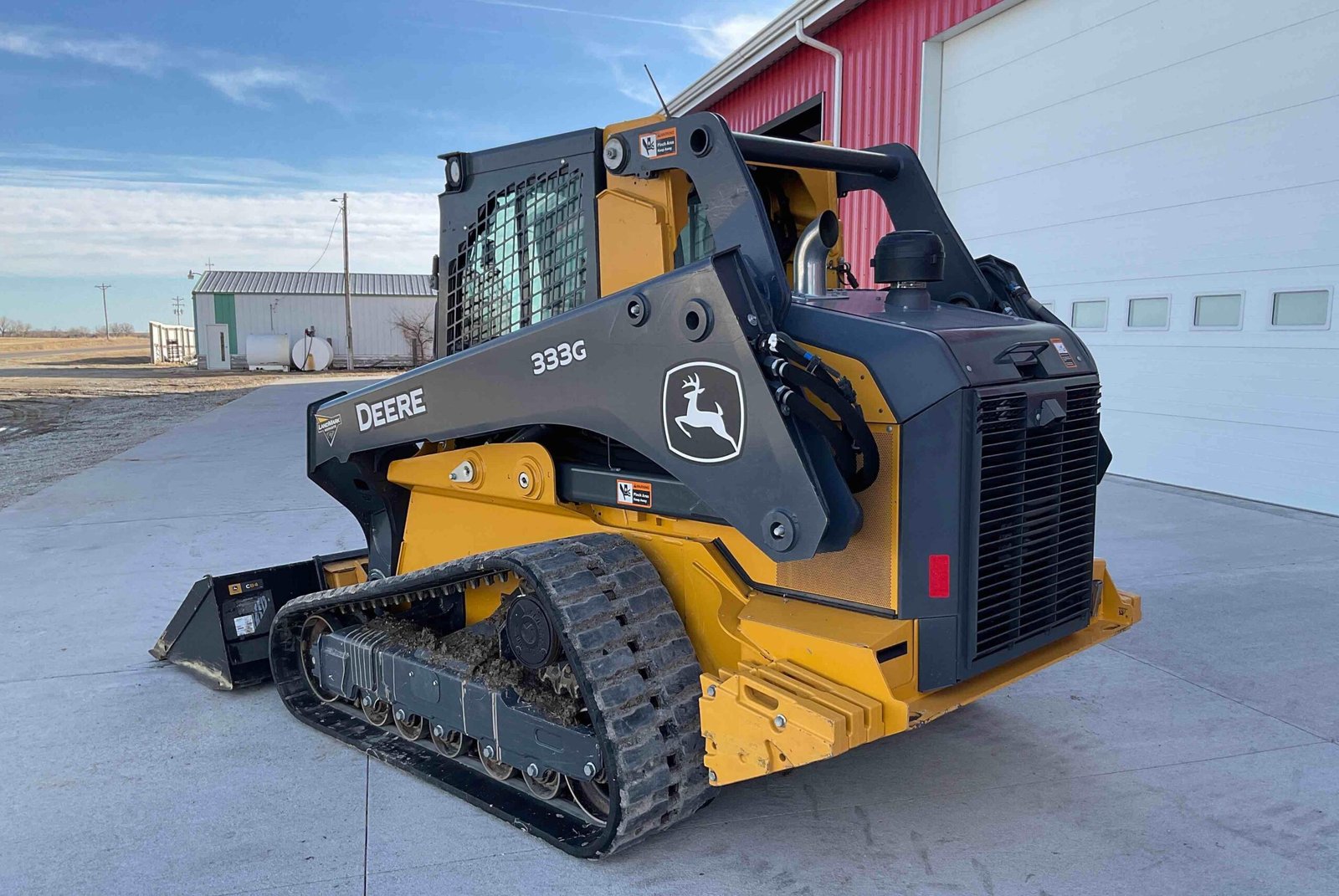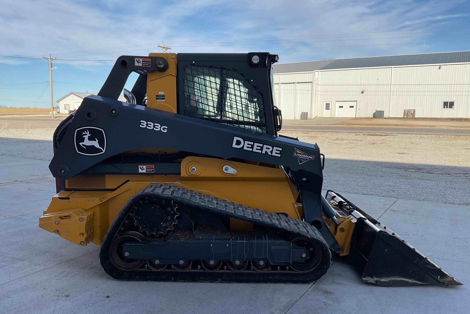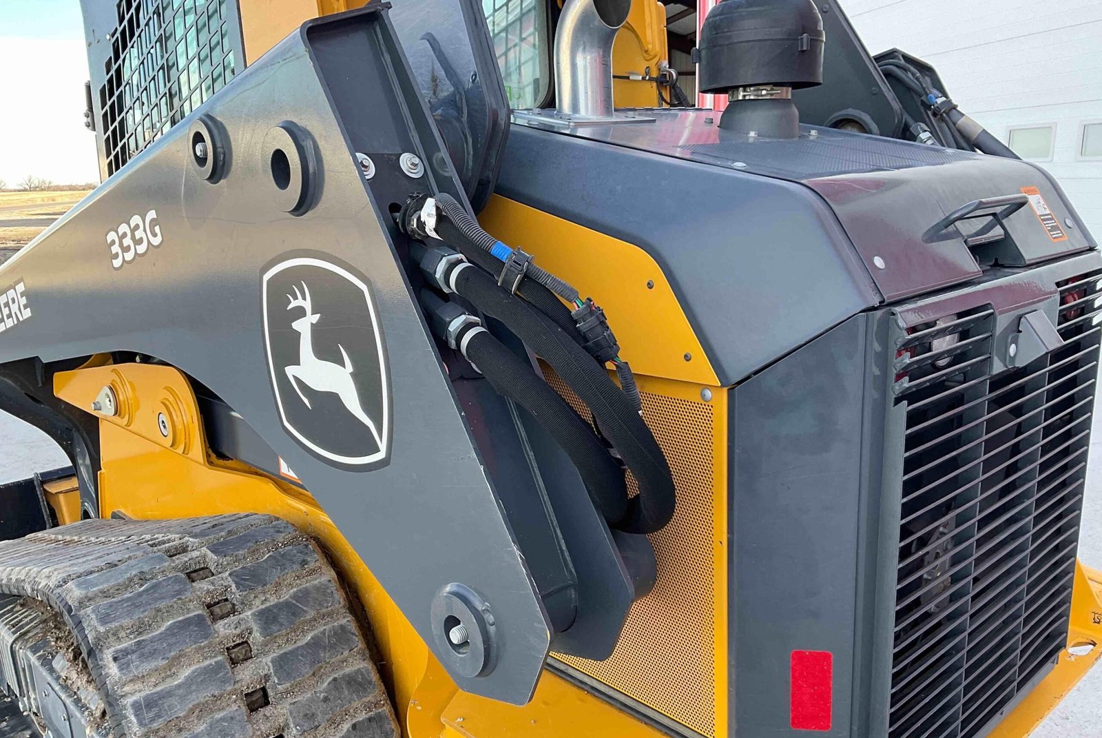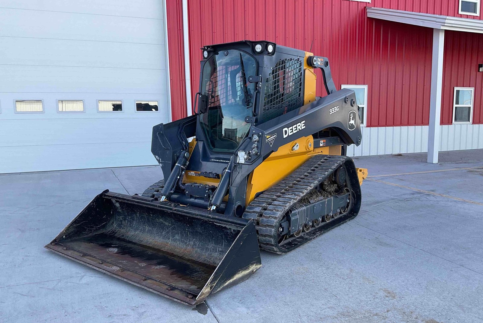 2022 John Deere 333G Compact Track Loader, 605 hours, high-flow hydraulics, cab w/ heat & A/C, air-ride seat, rear camera, Yanmar turbo diesel, 2-speed, ISO/H controls, 84″ bucket w/ bolt-on edge, 18″ tracks, counterweights.