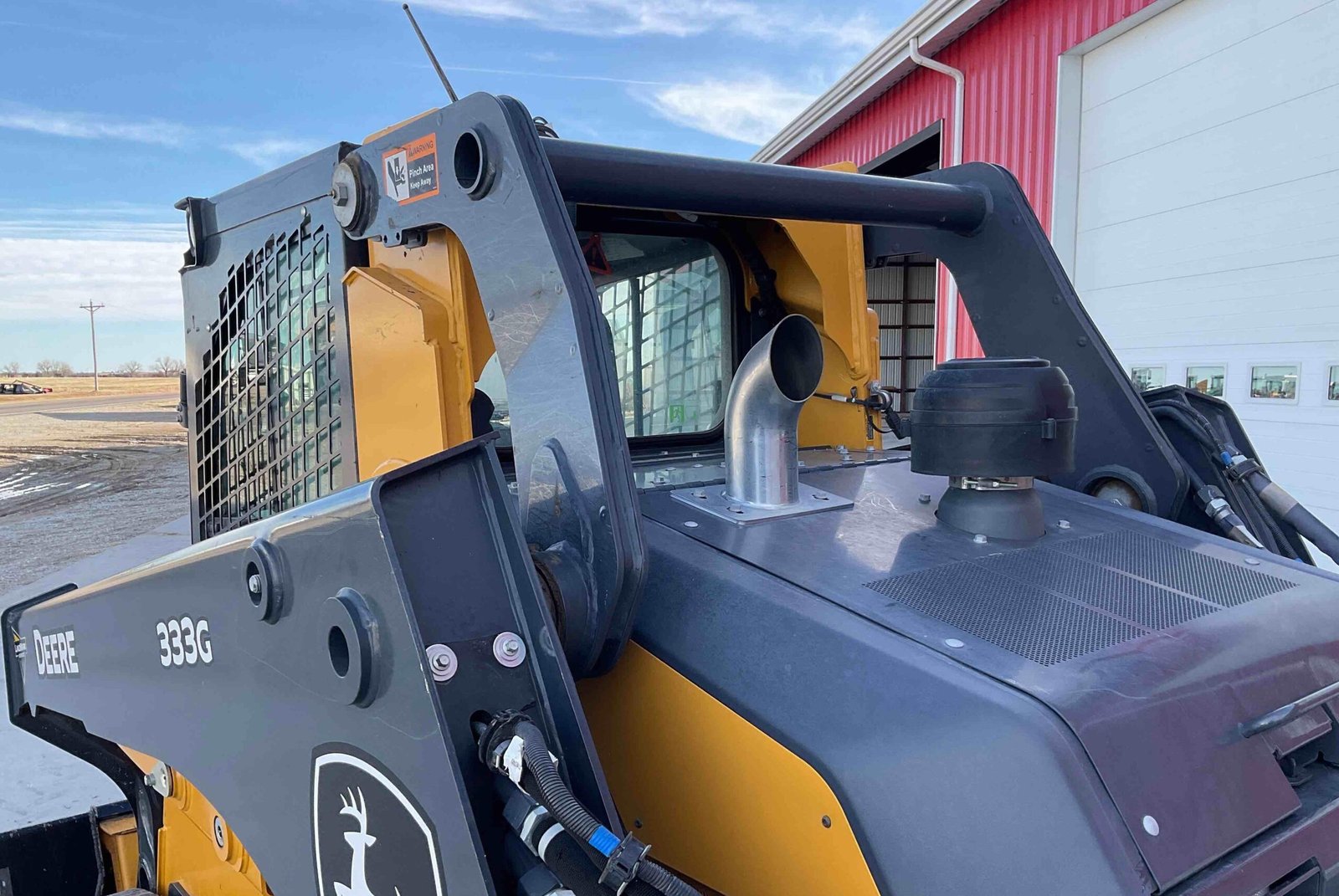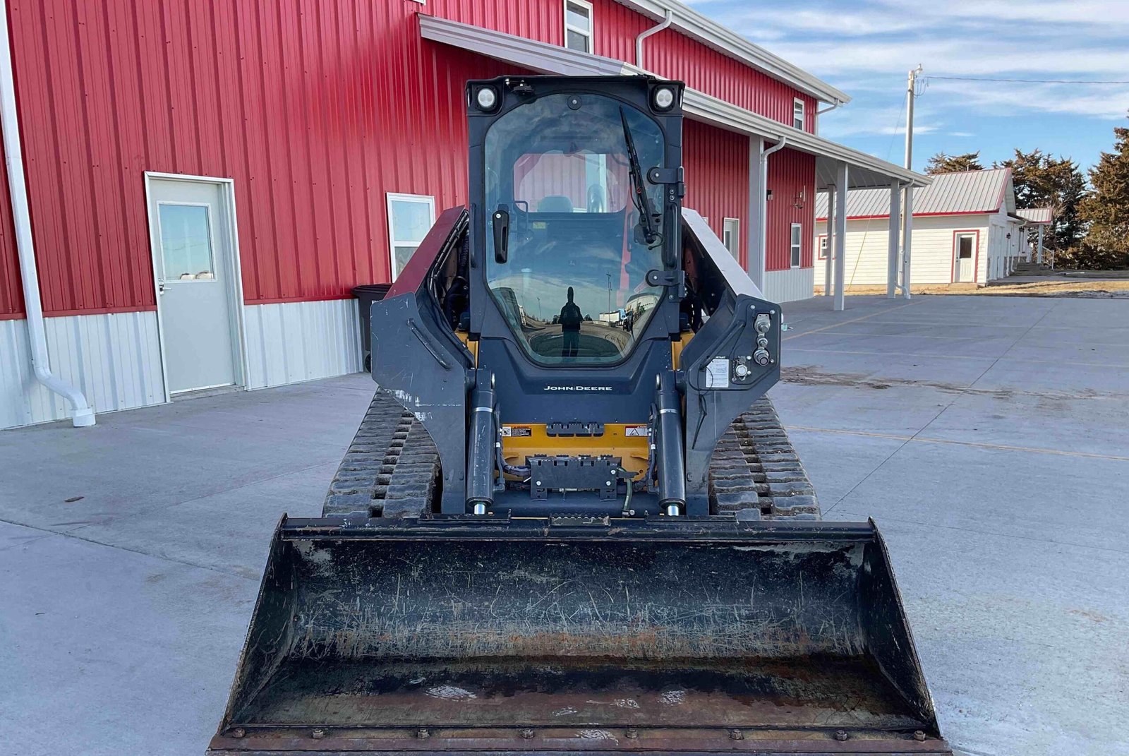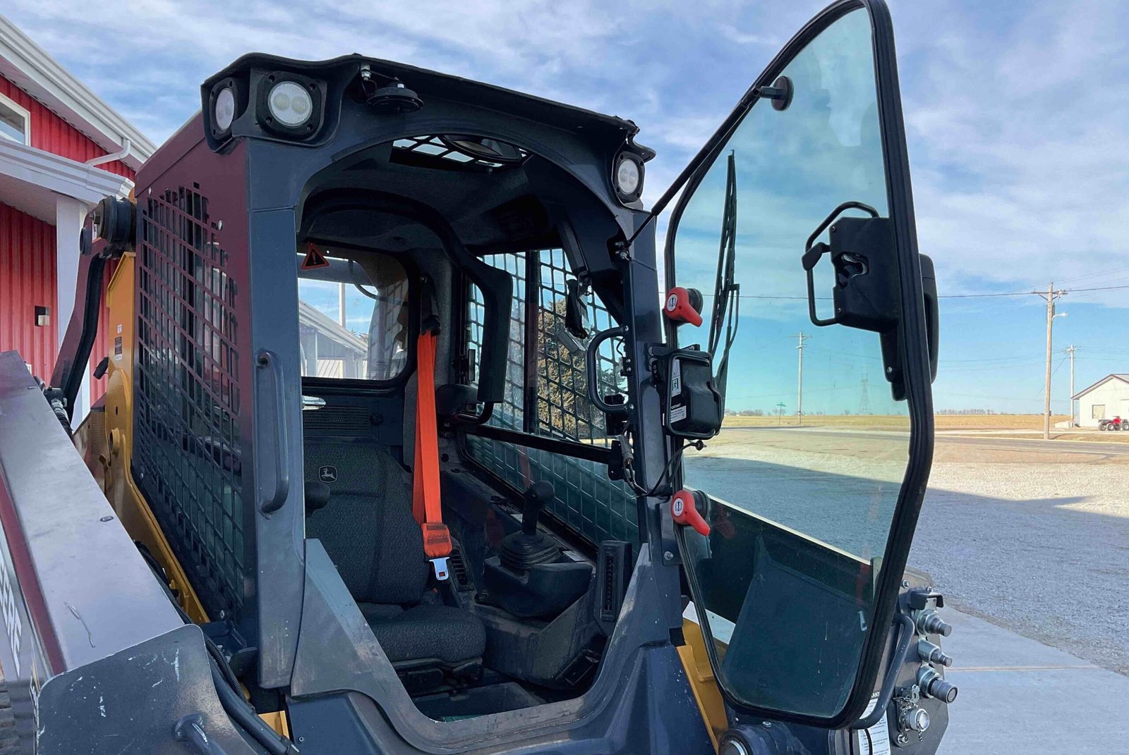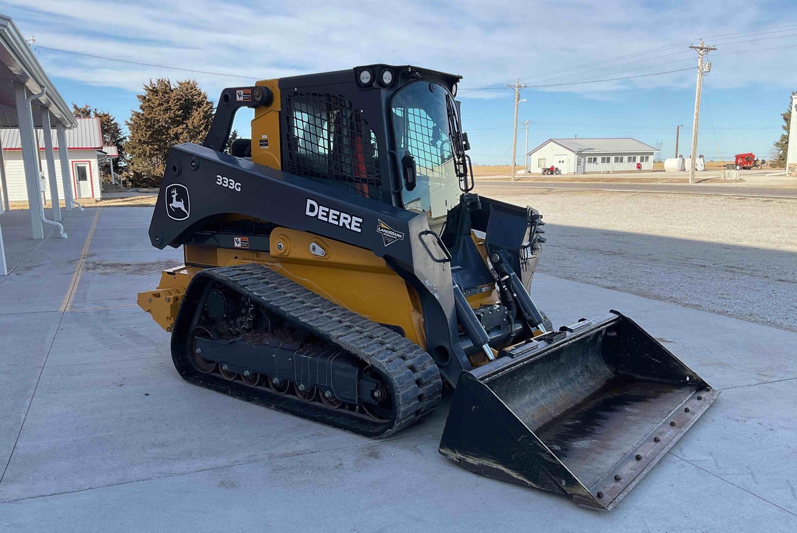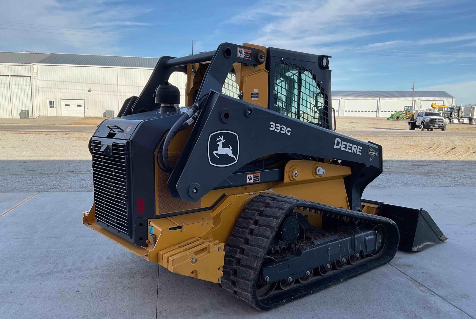 2022 John Deere 333G Compact Track Loader, 605 hours, high-flow hydraulics, cab w/ heat & A/C, air-ride seat, rear camera, Yanmar turbo diesel, 2-speed, ISO/H controls, 84″ bucket w/ bolt-on edge, 18″ tracks, counterweights.